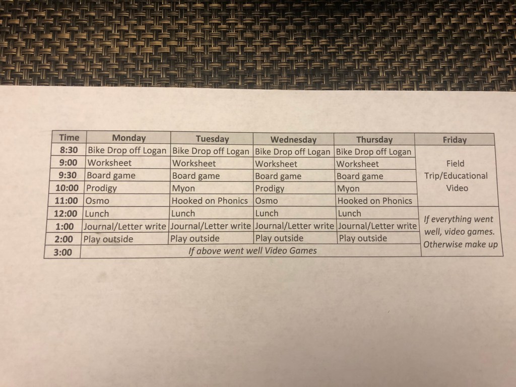 Week 1 schedule. I’m sure there will be many lessons learned and shift to something else next week. We have a few weeks to figure this out! Spent an hour scouring the internet for worksheets. No clue what they were studying in school. Hope we get more guidance next week from their teachers.We are going to encourage journaling this crazy time. We have some issues with writing so it could be painful.Big guns. mom still has to work. They need to do this autonomously. My office for the next month. 10 feet away.