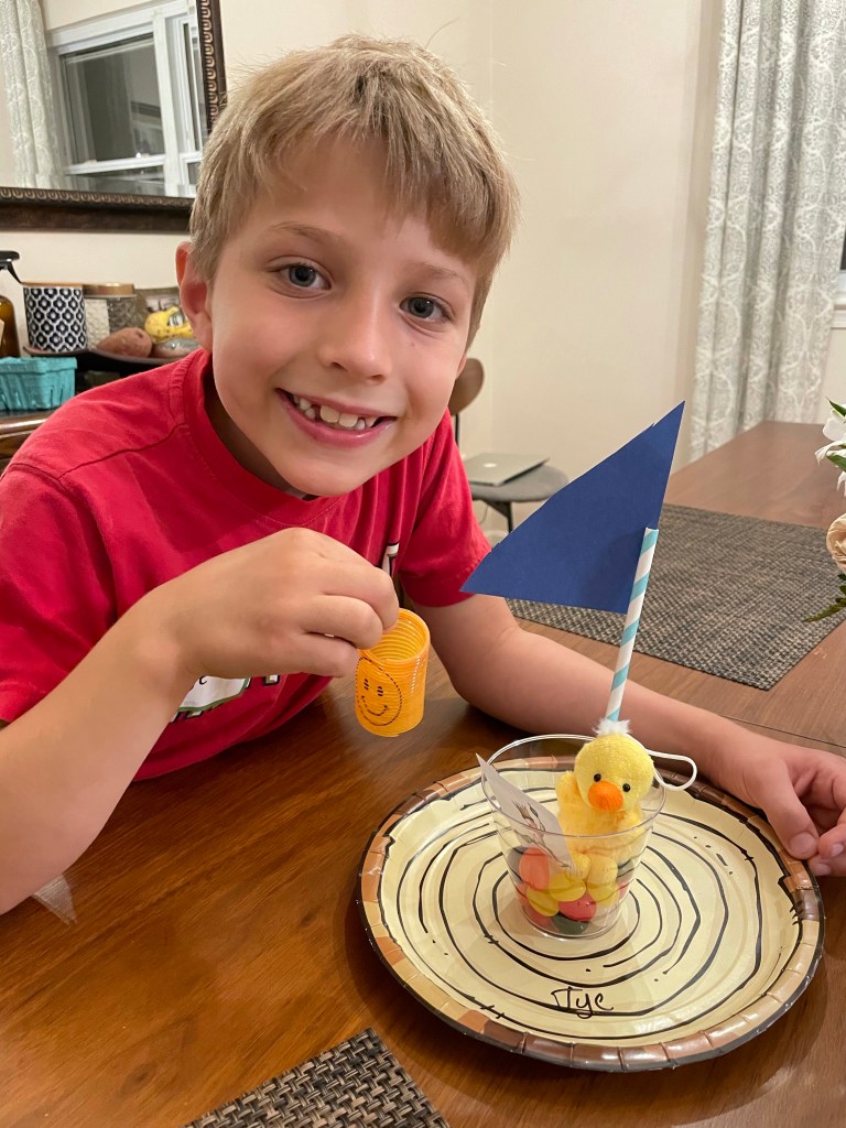 Tye attended a little party at Encourage on Friday. Along with pizza, he got the chance to combine two of his favorite passions; an art project that involved candy. They were jelly beans to be precise and he has them hid from Logan at the moment.
