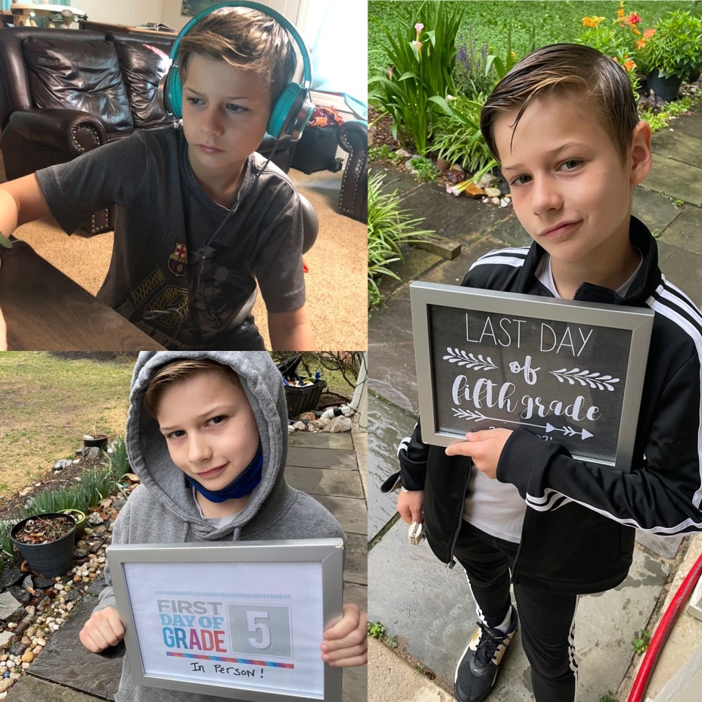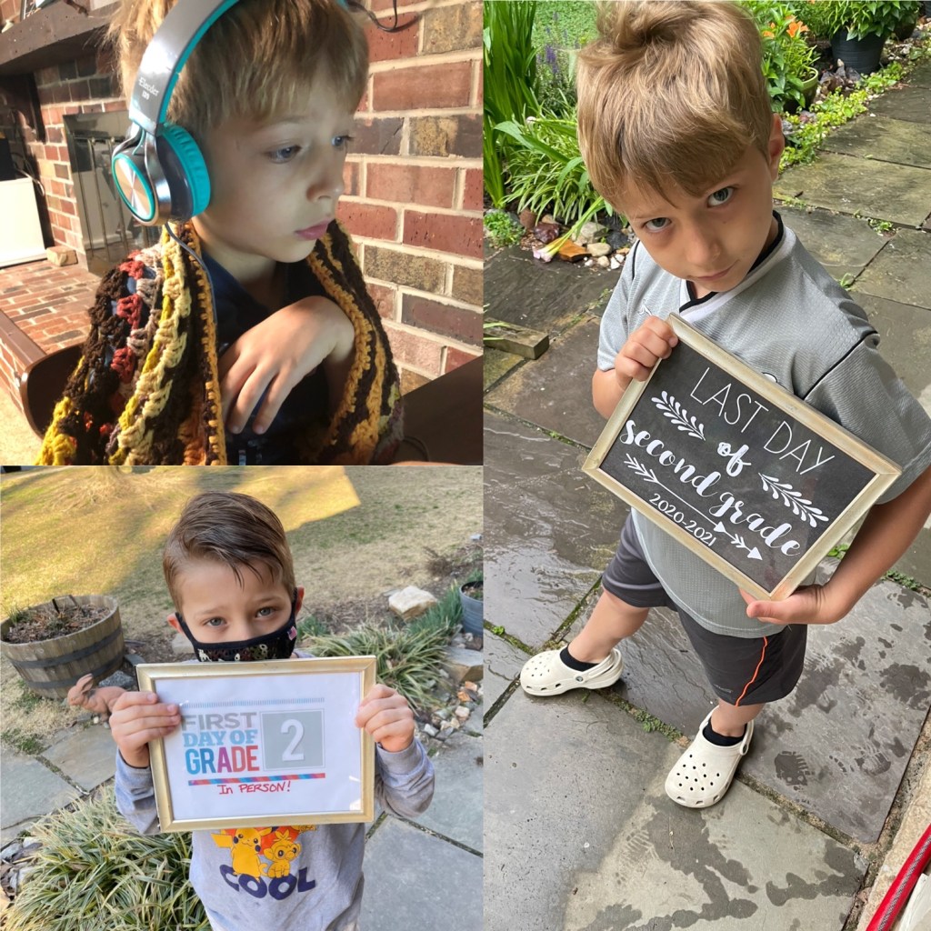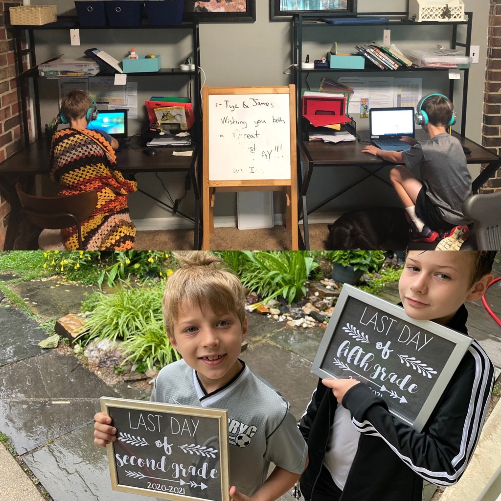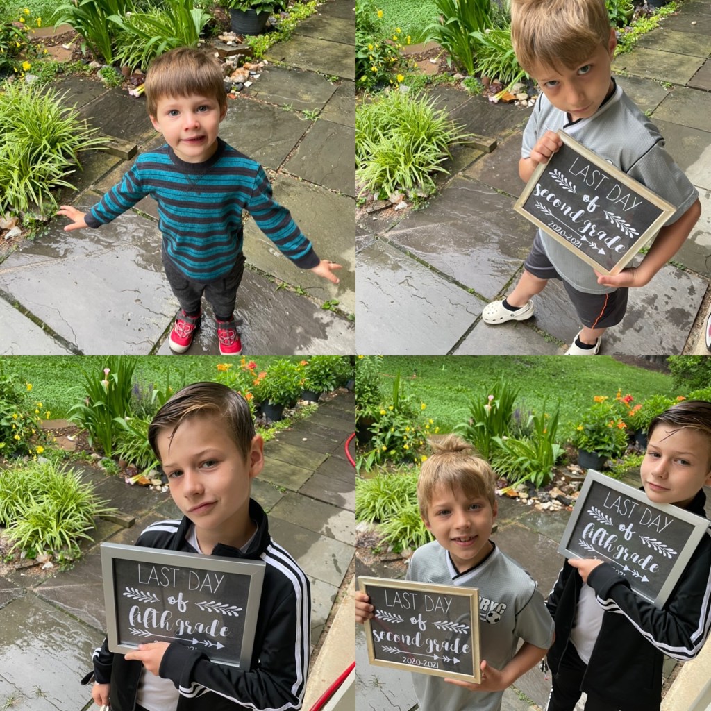 First and last day of school. It was a unique start to the year, but they’ve grown so much in so many ways.First day of school, first day in person, and last day of schoolThe little one wanted to make sure he wasn’t left out. This September he will have a sign to hold!