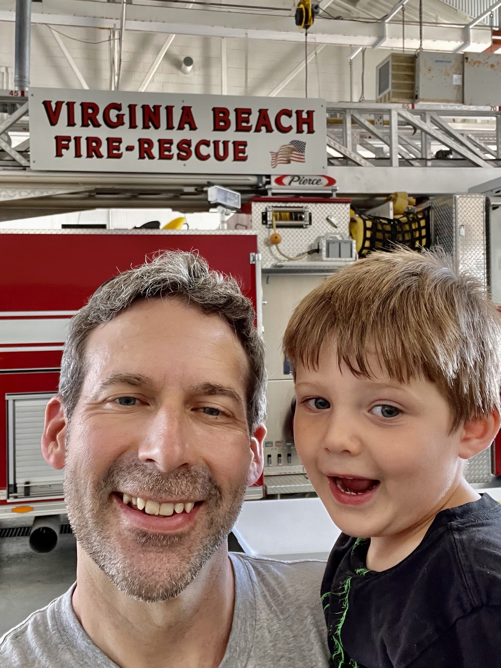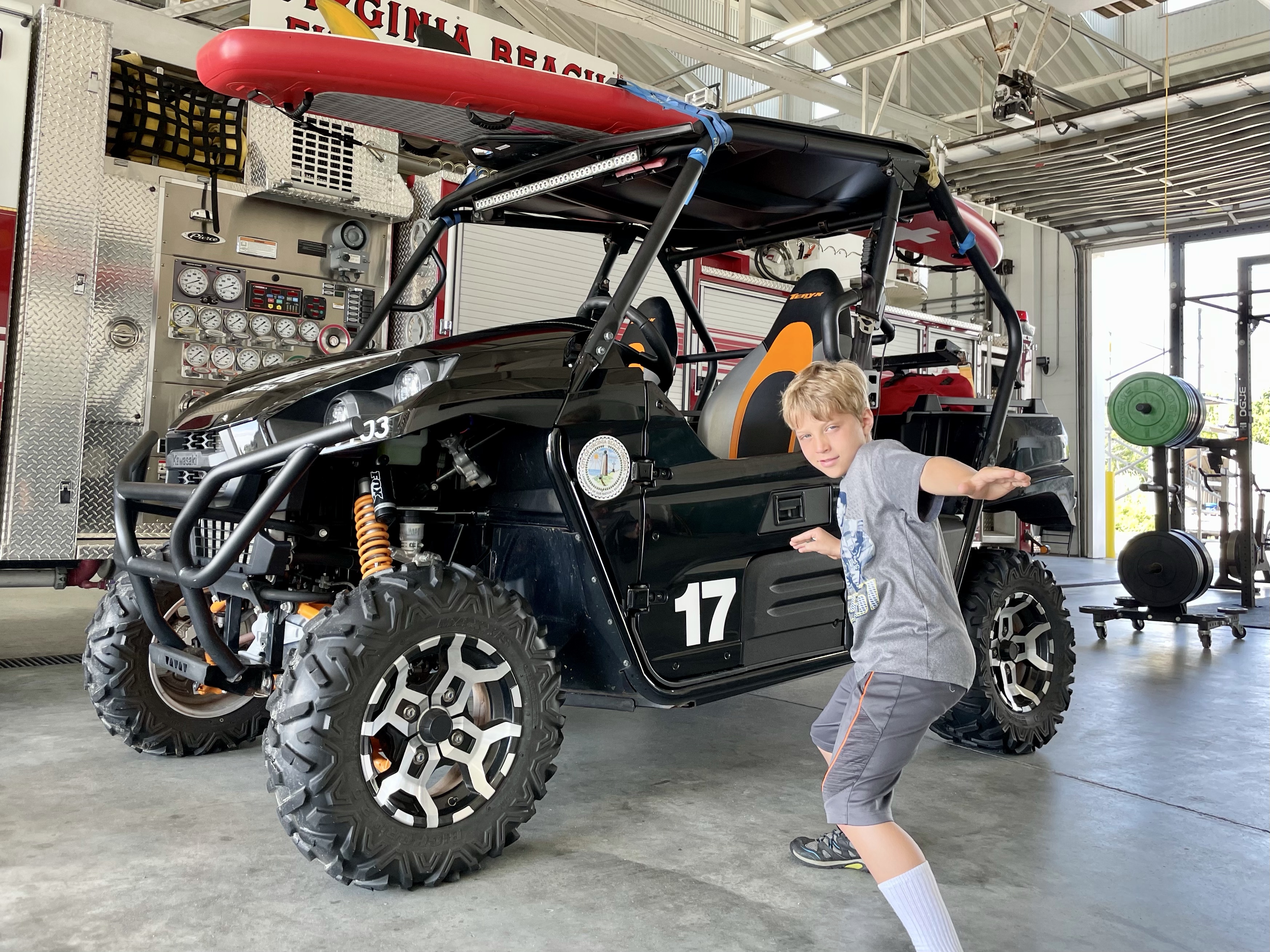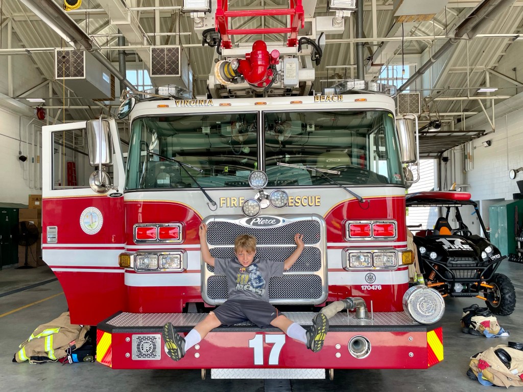 We stopped in at the local firehouse which was within walking distance. Logan was afraid to go in the firehouse as he thought there was “fire” in the firehouse. Tye is ready to join.